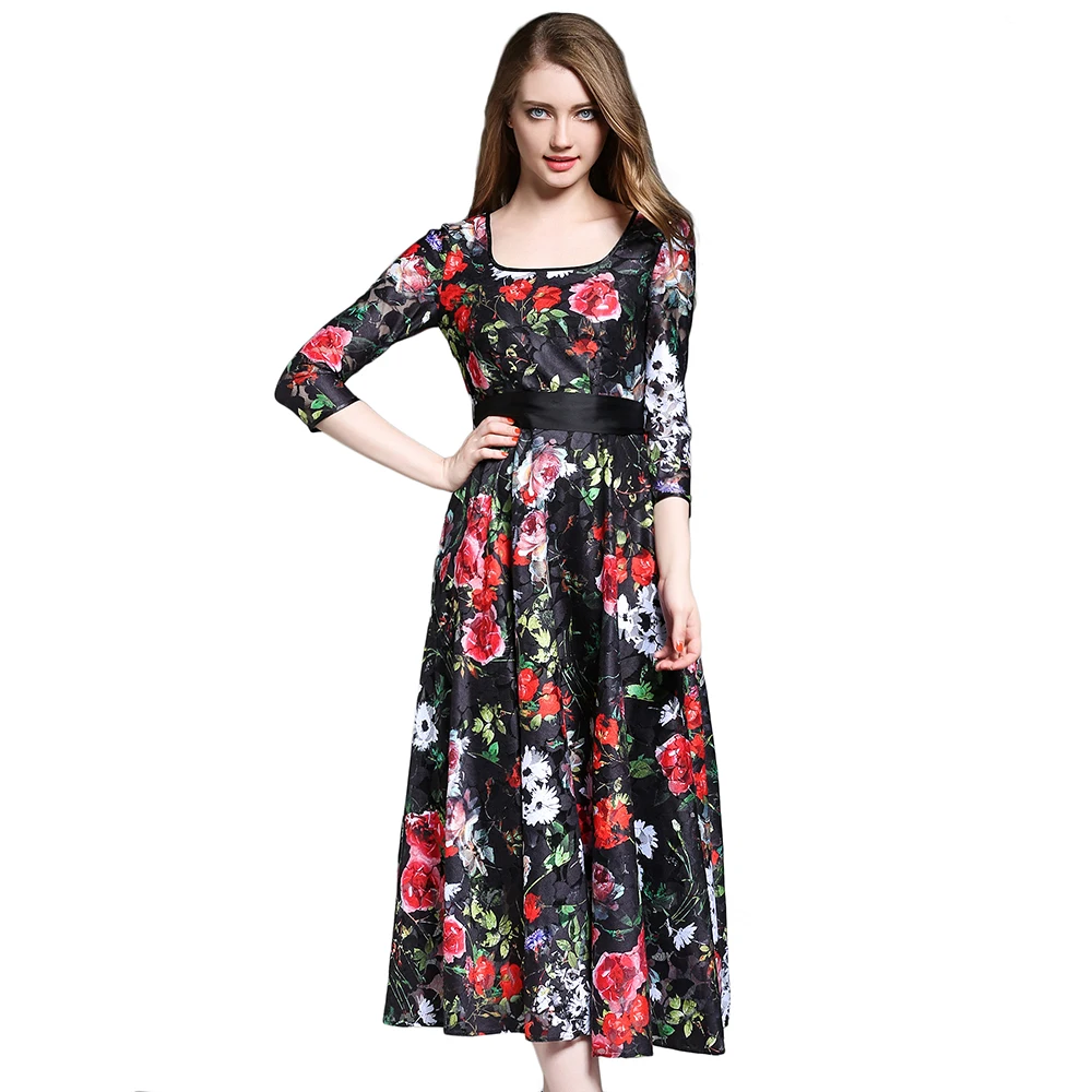 4.5 98 Video Reviews Plus Size Women Lace Dresses Floral Printed High Waist Vestidos Mujer Sashes Hollow Out Square Collar A-Line Female Robes N609YS plus-floral-dress