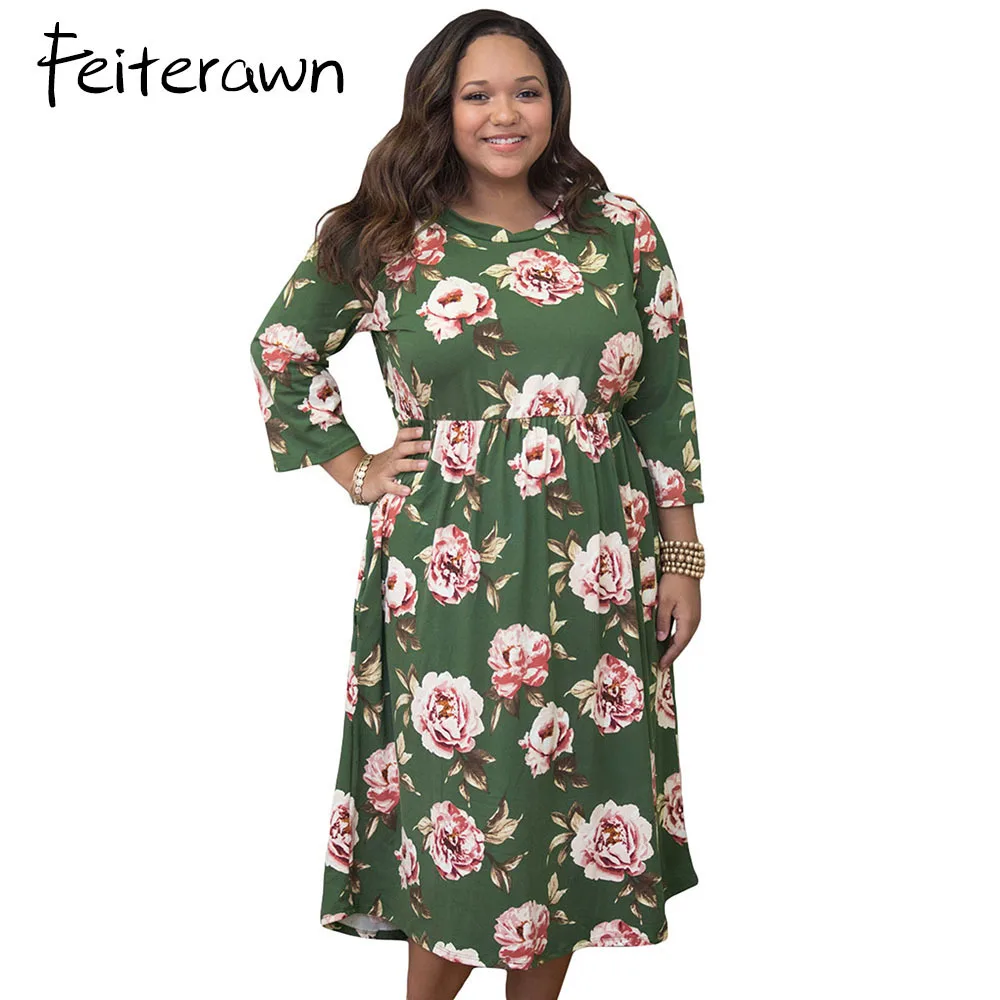 Feiterawn Women Plus Size Floral Midi Dresses O-Neck 3/4 Sleeve Robe Vestido 2017 Autumn Spring Lady Casual Loose Swing Dress plus-floral-dress