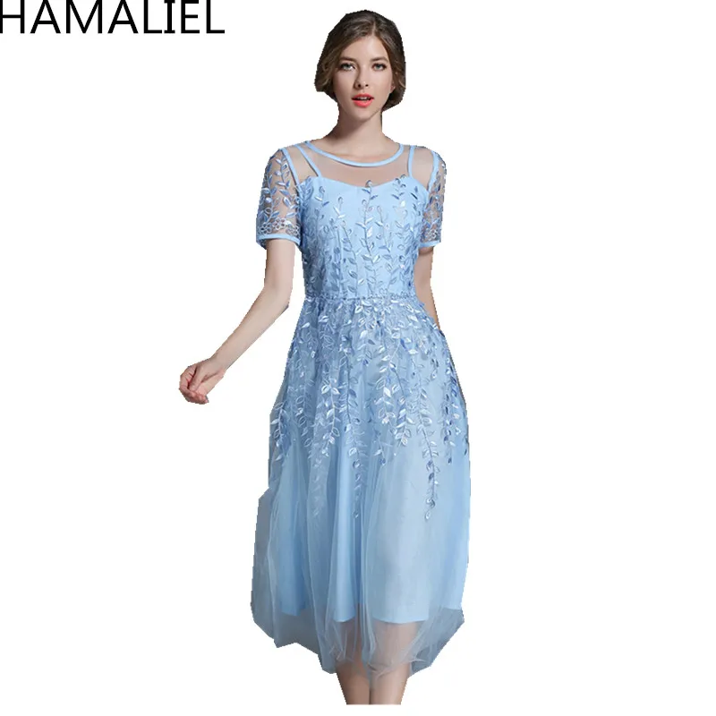 4.7 103 Video Reviews Luxury Summer Mesh Long Dress 2017 Women High End Blue Embroidery Floral Short Sleeve Female Elegant Slim Plus Size Party Dress plus-floral-dress
