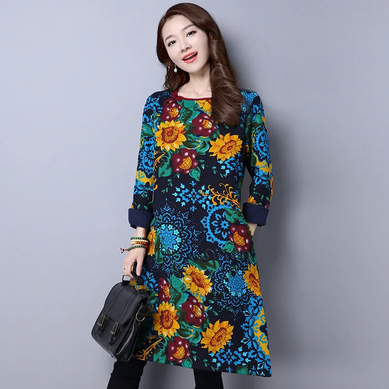 ilstile 2017 Lady Long Sleeve Floral Print O-Neck Midi Dress Velvet Plus Size Kaftan Cotton Linen Casual Dress Autumn Winter New plus-floral-dress
