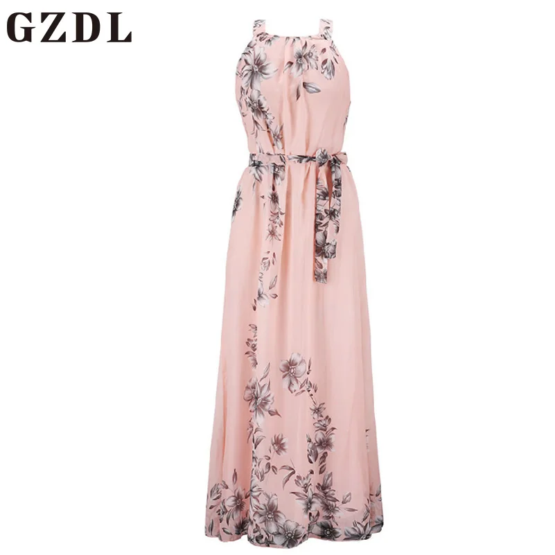 GZDL Sexy Summer Chiffon Belt Women Dress Plus Size Fashion Halter Sleeveless Floral Print Flare Party Dresses Vestidos CL4380 plus-floral-dress