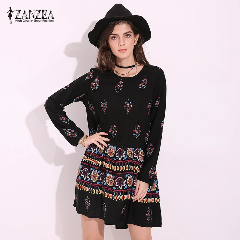 Check Price ZANZEA Women Vintage Long Sleeve Floral Printed O Neck Retro Ladies Loose Casual Beach Party Mini Dress Vestido Plus Size plus-floral-dress Revise
