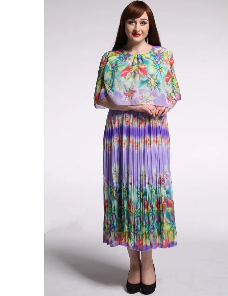 Womens Plus size Pleated Floral Printed Fit And Flare Mid-Calf Dress Elegant Round Neck Big Swing Chiffon Maxi Fashion Dresses plus-floral-dress