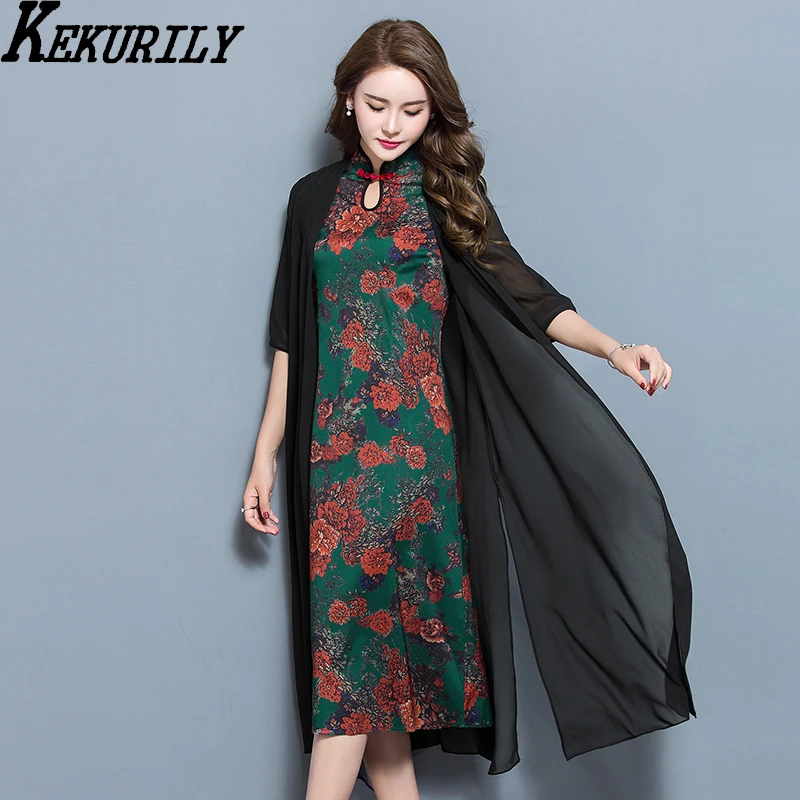 KEKURILY women cardigan dress silk floral vintage Chinese style fake two pieces dresses elegant plus size 3xl xxxl clothes plus-floral-dress