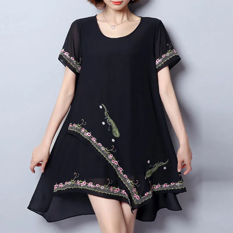 3XL 4XL 5XL Vintage Folk Ethnic Gypsy Women Short Sleeve O Neck Loose Plus Size Floral Embroidery Maxi Hippie Asymmetry Dress plus-floral-dress