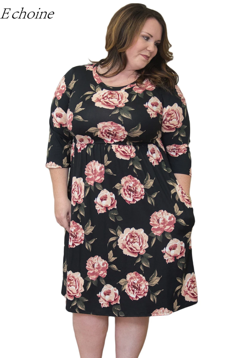 Echoine Gorgeous Black Floral Print Plus Size Dress 2017 Autumn New Three Quarter Sleeve Pockets High Waist Slim Midi Dresses plus-floral-dress