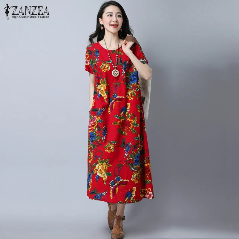 ZANZEA 2017 Women Short Sleeve O Neck Pockets Mid-Calf Dreeses Vintage Floral Print Loose Dress Robe Festa De Vestido Plus Size plus-floral-dress