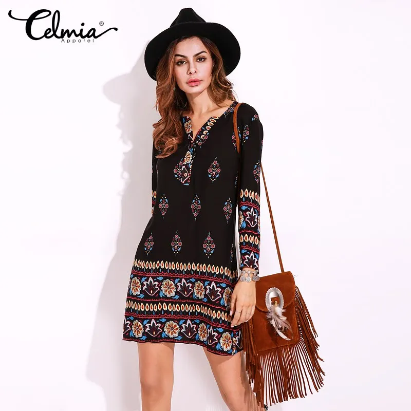 Check Price Women Summer Boho Mini Dress Ethnic V Neck Long Sleeve Floral Print Loose Sexy Short Elegant Shift Dress Plus Size 5XL Vestidos plus-floral-dress Opinion