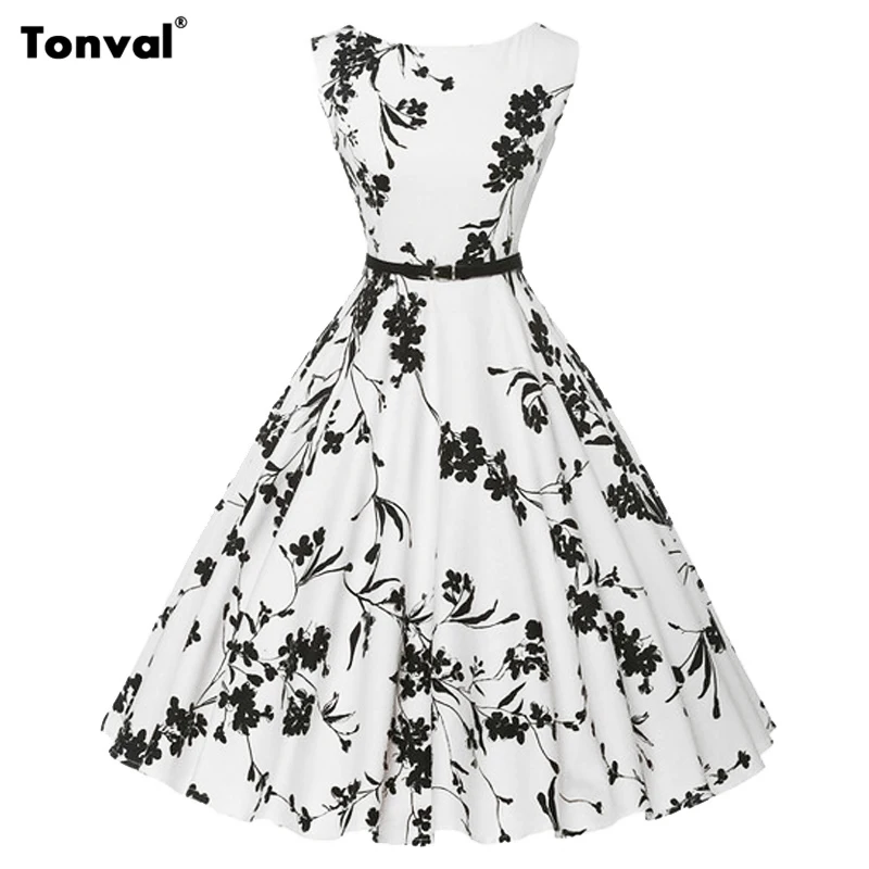 >> Cheap Discount Click! <<Tonval Flowers Print 1950s White Vintage Dress Women 4XL Plus Size Belted Floral Dress Summer Tunic Rockabilly Dresses plus-floral-dress