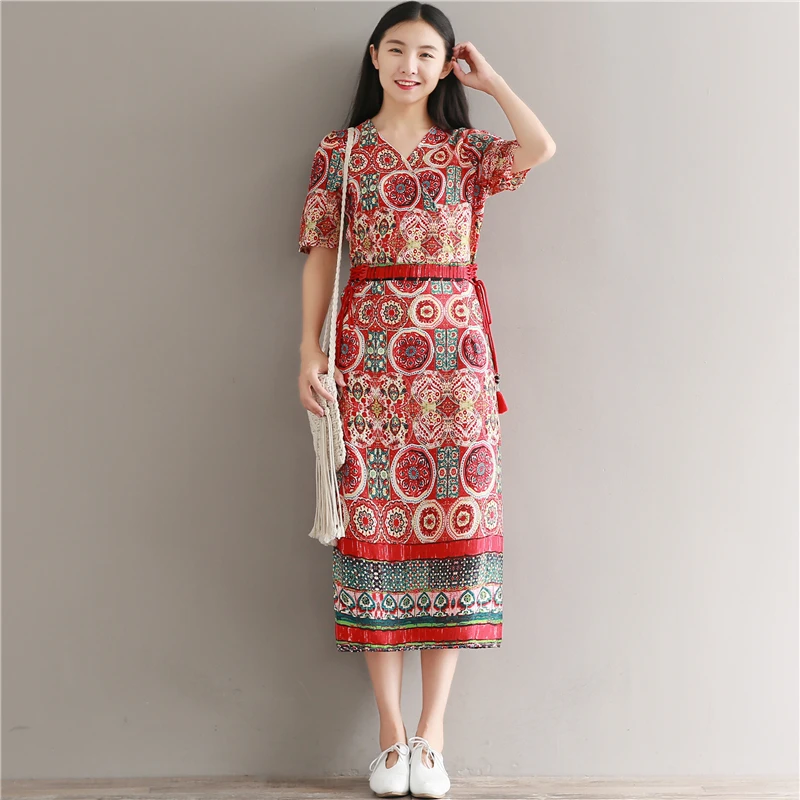Check Price Summer Women Dresses Plus Size Print Floral Red Green V Neck High Waist Drawstring Zipper Split Hem Chiffon cheongsam Dress plus-floral-dress reviews
