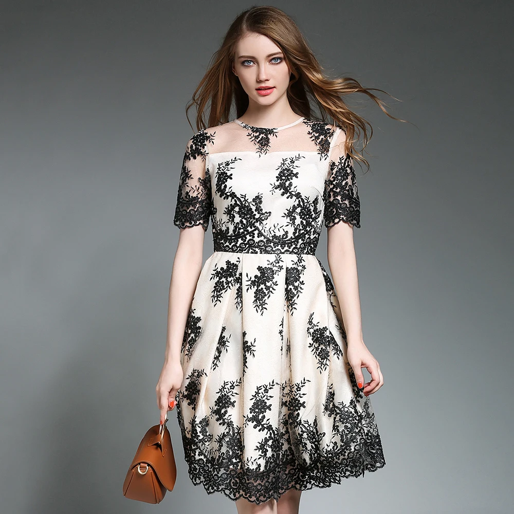 4.5 98 Video Reviews Plus Size Women Lace Dresses Short Sleeves O-Neck Vestidos Mujer High Waist Floral Embroidery Dress Femme Hollow Out Robe N609YS plus-floral-dress