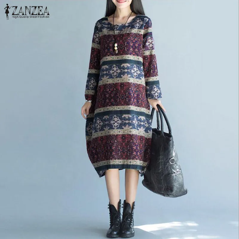 >> Used Click! <<2017 ZANZEA Retro Floral Print Women Autumn O Neck Long Sleeve Casual Loose Pockets Vintage Knee Length Dress Vestido Plus Size plus-floral-dress