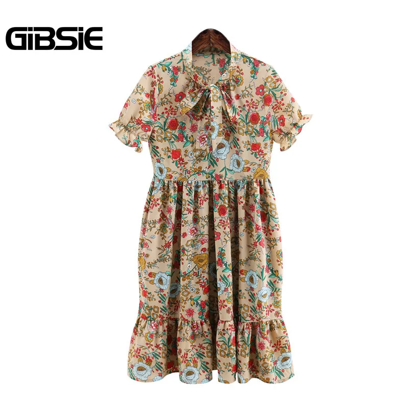 Check Price GIBSIE Plus Size Women Clothing Floral Print Vintage Dresses 4XL Summer One-Piece Casual Loose Bow Short Sleeve Midi Dress plus-floral-dress Learn