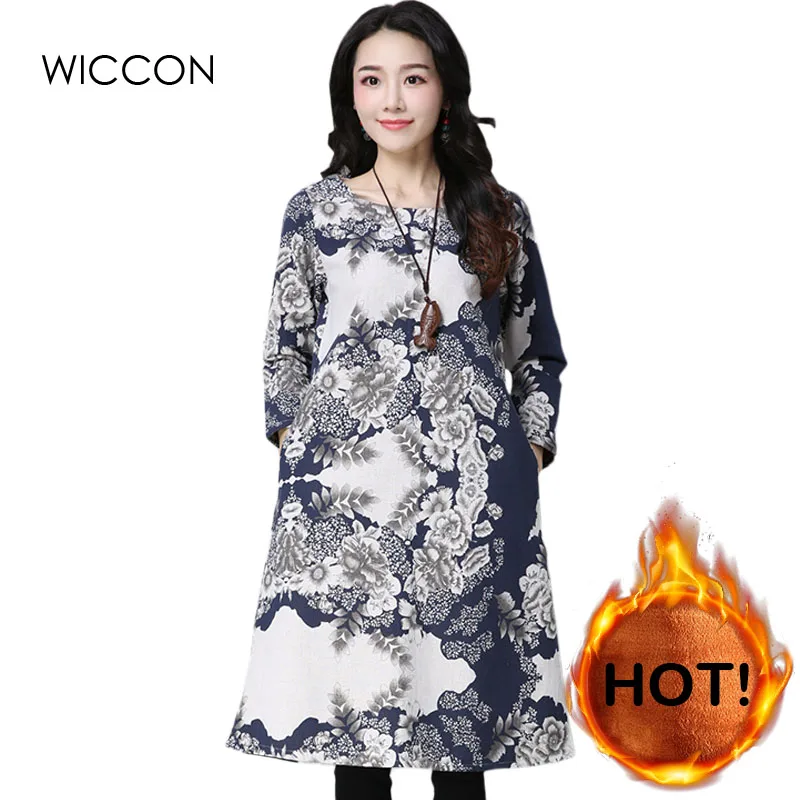 Vintage Warm Women Long Sleeve Floral Print Dress Plus Velvet Casual Cotton Linen Dress Plus Size M-2XL Autumn WICCON plus-floral-dress