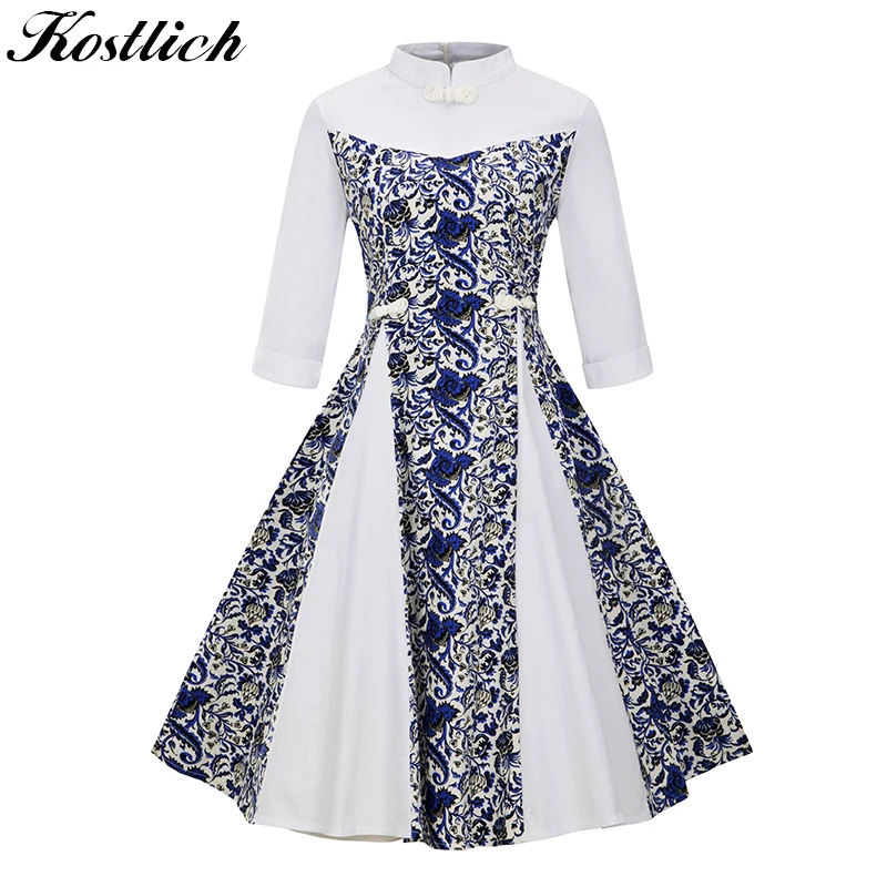 Kostlich Print Floral Retro Autumn Dress Women Mandarin Collar 3/4 Sleeve Vintage Dress 2017 Elegant Party Dresses Plus Size 4XL plus-floral-dress