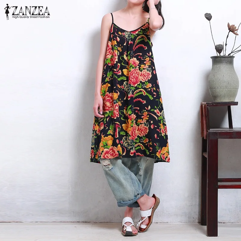 ZANZEA Women 2017 Summer Retro Floral Print Dress Sexy V Neck Strapless Sleeveless Casual Loose Dress Vestido De Festa Plus Size plus-floral-dress