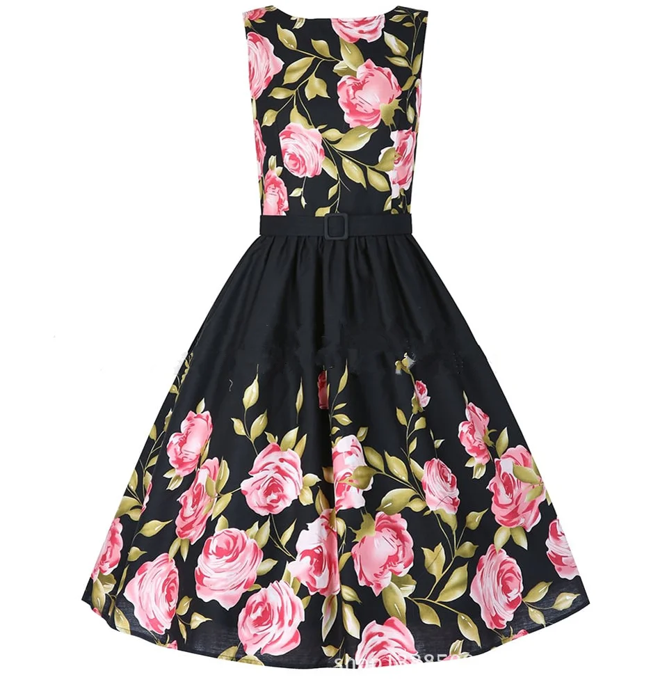 New Selling Retro Vintage Floral Printed Women's Round Neck Sleeveless Empire Waist A-Line Belted Plus Size S-4XL Women's Dress plus-floral-dress