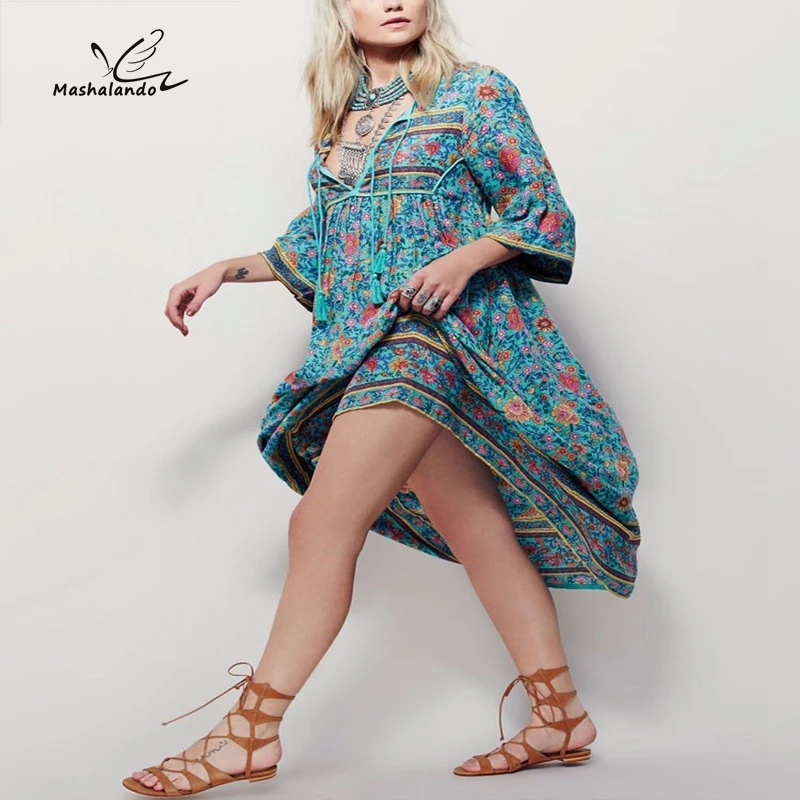 Femme Boho Long Fringe V-neck Sexy Floral Print Vestidos Plus Size
