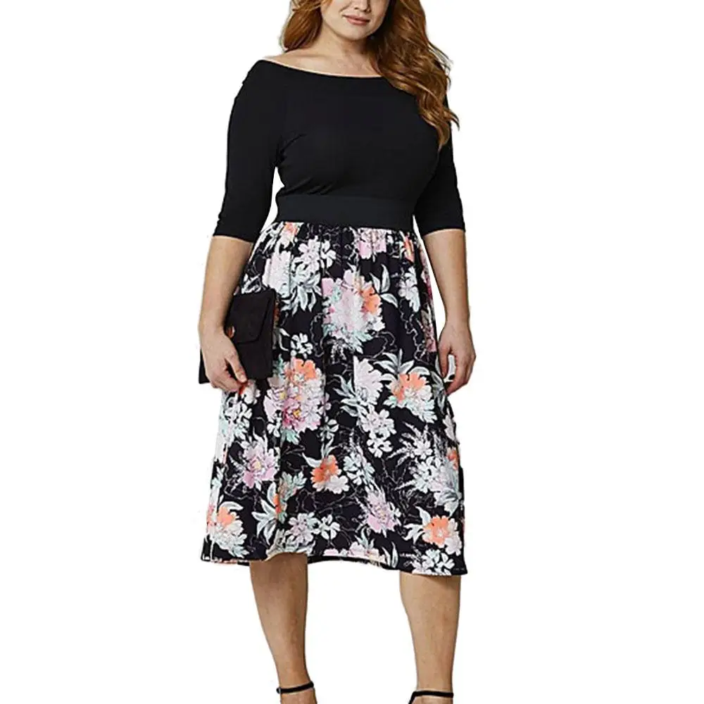 2017 New Fashion Women Floral Print Dresses Splicing Mid-Calf O-Neck Half Sleeve Autumn Vestides Female Dress Plus Size X-3XL plus-floral-dress