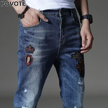 Cheap price POVOTE spring new embroidered jeans men's slim elastic jeans fashion brand men's Jeans Classic pants trend design Jeans Special Order Now! good quality